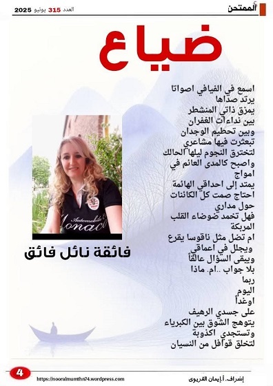 فائقة نائل فائق ولادة بغداد – العراق، مقيمة في هولندا. أنا شاعرة وكاتبة، ومصورة فوتوغرافية ومصممة جرافيك، ومصممة ومنسقة زهور، حائزة على شهادة بكلوريوس أكاديمية الفنون الجميلة /جامعة بغداد Graphic Design حائزة على دبلوم فنون تطبيقية /هيئة التعليم التقني/ بغداد، وشهادة تصميم وتنسيق الزهور من هولندا Nederland Clusius College/ Flower Design، عملت في وزارة التعليم العالي/ الجامعة التكنولوجية/ بغداد، أسست جريدة / افاق العلوم التطبيقية / بغداد، حاصلة على العديد من الشهادة لدورات والكورسات في مختلف أنواع الفنون، حاصلة على العديد من الشهادات التكريمية في مجال الشعر والأدب، حاصلة على شهادة دكتوراه فخرية/ الاتحاد الدولي للمثقفين العرب، عضو في، مجلس الإدارة للإتحاد المثقفين العرب، عضو في مجلس منبر الأدب والفنون، سفيرة السلام. وعن مسيرتي الأدبية تصدرت لغلاف مجلة برشلونة الأدبية/ إسبانيا تم وضعها على رفوف مكتبة هولندية /Heiloo، لدي عددة مطبوعات ورقية مشتركة مع كتاب وشعراء من مختلف أنحاء العالم.